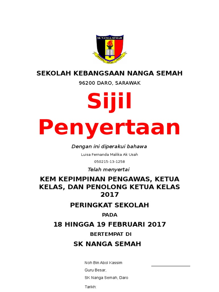 Contoh sijil penyertaan kem motivasi upsr 2010. Di dalam sijil mereka tertera keputusan keseluruhan pencapaian mereka dalam KBS dari Tahun 1 hingga Tahun 6. Sijil Penyertaan Dengan ini diakui bahawa ZINTA ARYANTI ANAK MAGDELINE UPEK 030509131458 telah menyertai KARNIVAL UNIT BERUNIFORM 2014 mewakili PANDU PUTERI TUNAS pada 05 07 NOVEMBER 2014 bertempat di SK SANGAN IBAN TATAU Tahniah dan terima kasih.