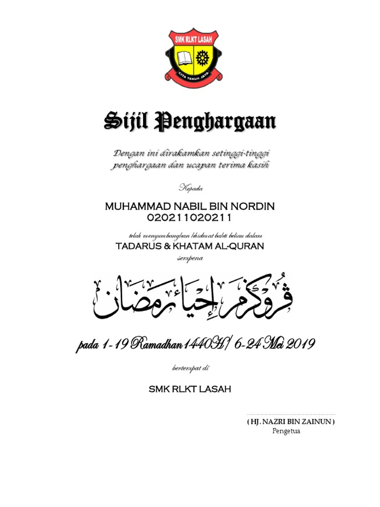 Sijil Penghargaan Khatam Quran Pdf