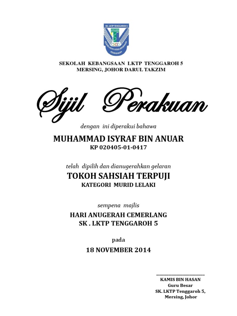 Sijil Penghargaan Anugerah Tokoh Pelajar 2013 Smk Kunak. You can also bookmark this page with the URL. Newer Post Older Post Home.