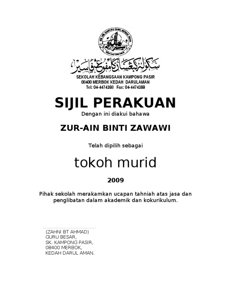 972013 600 pm. Sijil Penghargaan Wakil Sekolah. Saya Amirah binti Azmi yang bernombor MyKad 880413-43-5052 bekas pelajar IPG Kampus Tawau dari unit PISMP Pemulihan Ambilan Januari 2009 mewakilkan Mohamad Azhar bin Arsad yang bernombor MyKad 890123-12-5477.