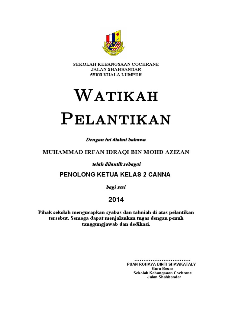 Contoh Surat Watikah Pelantikan Pengawas Pusat Sumber Nah. Sijil pelantikan adalah disahkan bahawa nur syazwani bt roslan ba 68193 telah dilantik sebagai ahli jawatankuasa kelab doktor muda bagi tahun 2014 tahniah dan syabas. Teks pengacara majlis watikah perlantikan 2012 Hamsah Saram.